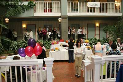 Your table will be approximately 6ft and will be covered with white table cloth and skirt around table. The vendor table will be set up in the atrium outside of the Grand ball room at the Embassy Suites Hotel.